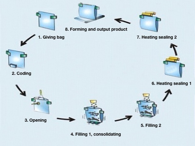 Abiadura 10-35 pouches/min (Abiadura produktuaren egoeraren eta betetzearen pisuaren araberakoa da) pisu 1400KGS 1520KGS 1580KGS 1650KGS Tentsioa 380V 3fasea 50HZ/60HZ Potentzia osoa 2kw 2.2KW 2.5kw 2.5kw Konprimatu airea 0.8m3/min(erabiltzailearen hornidura) 8bar Produktuaren Prozesua