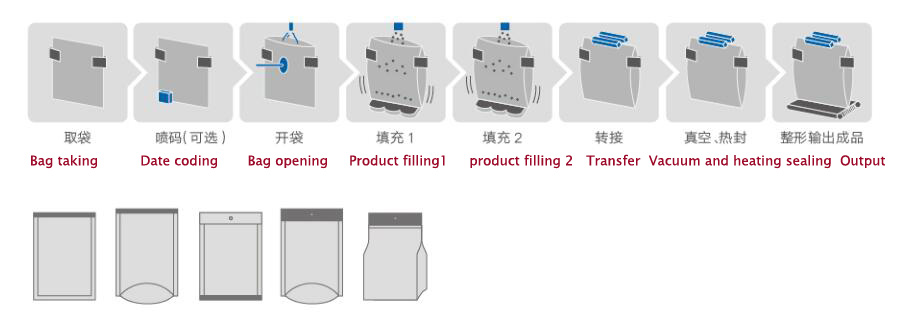 Intxaur hutsean ontziratzeko makina ontziratzeko makina guztiz automatikoa da. Intxaur hutsean ontziratzeko makina mota berri bat da, poltsa motako fruitu lehorrak ontziratzeko makina birakari hutseko sistema bat gehituz garatutakoa. Bere lan-prozesua hau da: lehenik Z motako elikadura-gailua erabili, materiala konbinazio-balantza elektronikora garraiatu pisatzeko eta, ondoren, materiala pasa, bete eta zigilatzeko. Aurreko poltsak elikatzeko ontziratzeko makina urrats honetara iristen denean, produktua zuzenean zigilatzen eta ateratzen du. Baina meloi hazia hutsean ontziratzeko makinaren aldea da materiala elektronikoki pisatzen dela, eta poltsa bete ondoren, ez da zuzenean zigilatzen, baina poltsa hutseko sistemara garraiatzen da xurgagailuaren gailuaren bidez, eta zigilatzeko irteera. hutsa agortu ondoren egiten da.