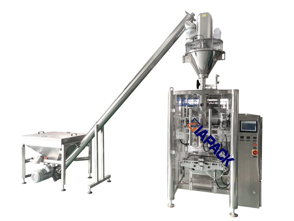 Auger betegarriko makina. Esne Powder. Forma bertikal txikia betetzeko zigilua makina batez ere hauts eta irin produktuak saltzeko erabiltzen da, esaterako, haurrentzako elikagaiak, haurrentzako janaria, sesamo pasta, gatza, azukrea, irina, almidoia, zaporeak, esne hautsa, albumen hautsa eta abar.